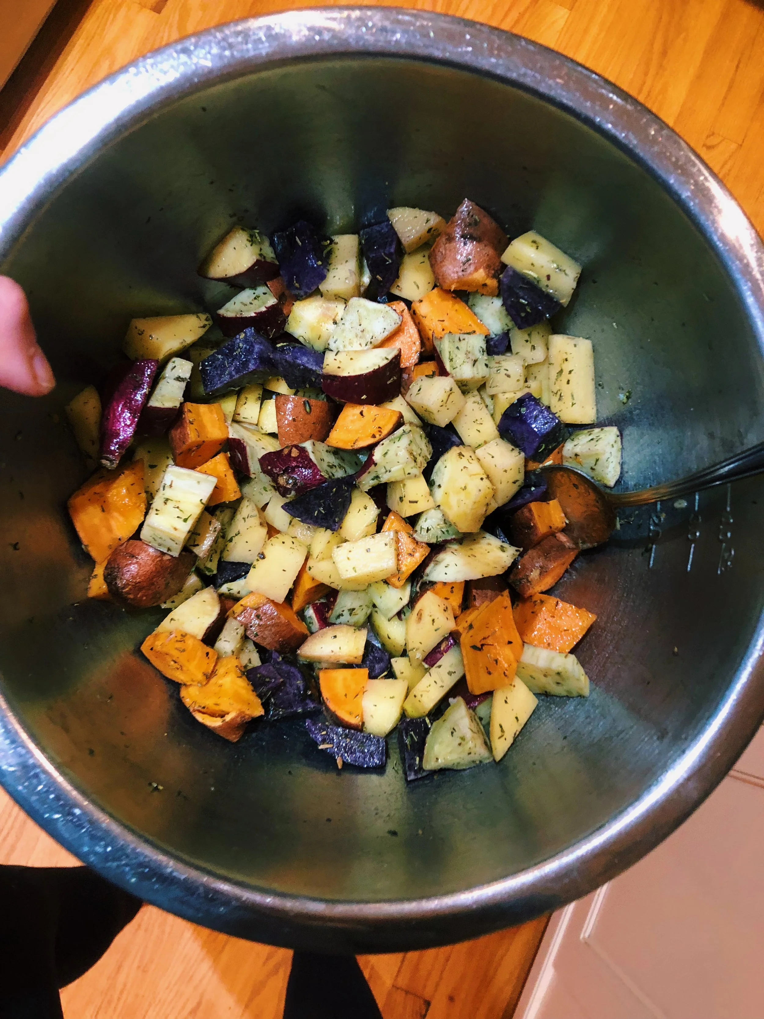 My love for potatoes evolved from mashed potatoes, to roasted sweet potatoes, to literally any potato on this earth. So what did I do with this love fest? I combined all of my favorite potatoes into one dish. And let me tell you, you will not be disappointed. The sweet potato gave a touch of sweetness, the Japanese sweet potato roasts easily, the yellow potato provides a lighter texture, the purple potato has a dry and starchy texture, and gives a pop of color! You can’t go wrong with this combo. All of these potatoes play a different role in this dish, but together, they create the perfect texture, roast, and taste.